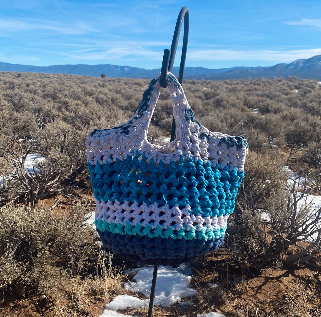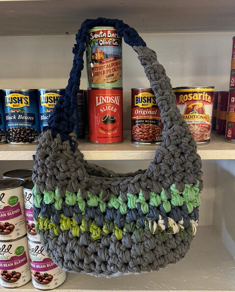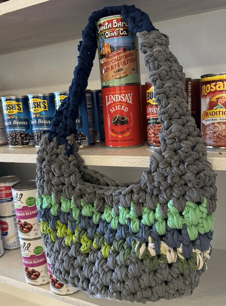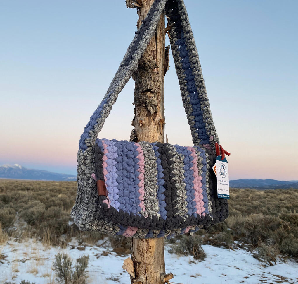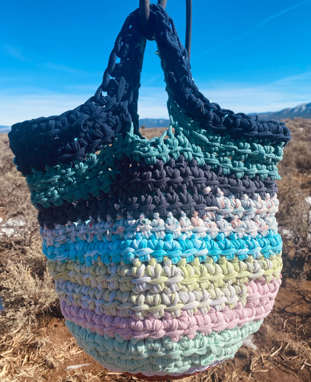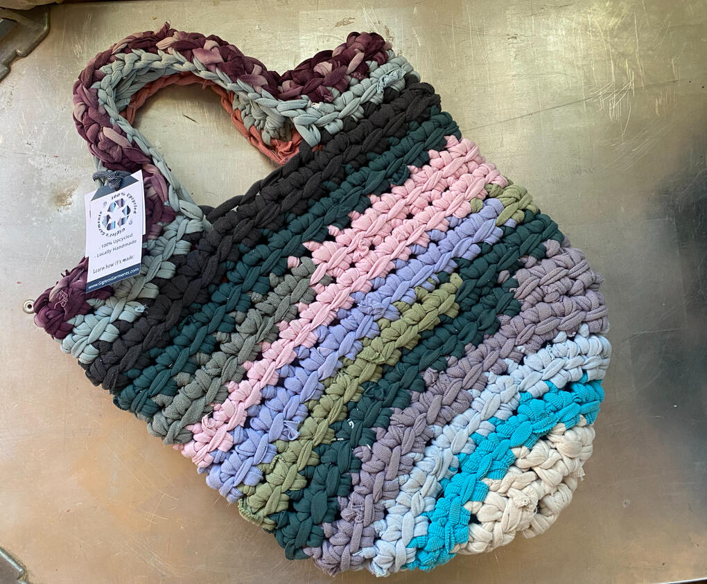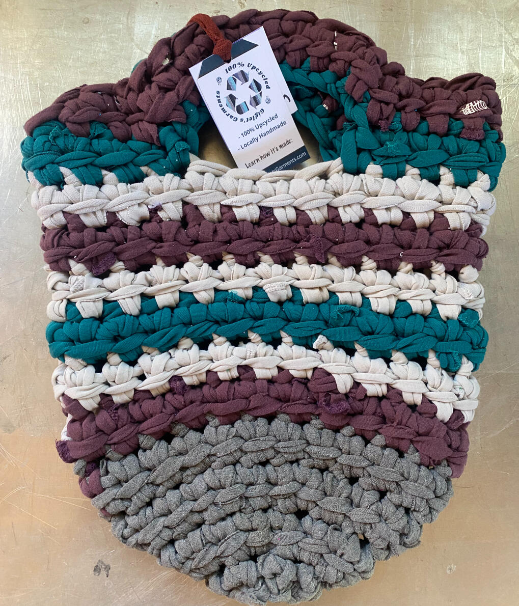 Make your trips to the market and more eco friendly with our 100% upcycled tote bags! These bags are hand-crafted from clothing that would otherwise be headed to the landfill. They are hand or machine washable, durable, and stretch to fit all your essentials. Keeps 6-7 articles of clothing out of the landfill.