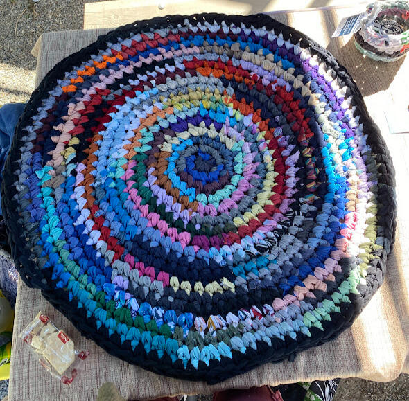 The hem rug is a particularly unique item because it is made entirely of hems, which would otherwise go to waste. It's thick and squishy and in a whimsical multi-colored random pattern. Saves approximately 50 hems from the landfill.